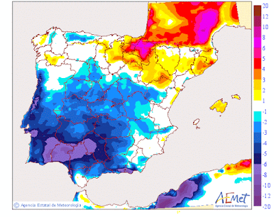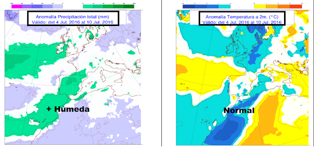 Según los modelos de Anomalías de AEMET (aquellos en los que se valora la situación actual respecto a unos valores promedios) se espera una  Anomalía normal respecto a la temperatura y  más húmeda,   respecto a la precipitación.