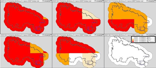 .. es decir, que esperamos un semana con temperaturas altas propias de la epoca y si hay mayor posibilidad de precipitación va a ser por una la presencia de una vaguada de aire frío en altura que va a inestabilizar bastante el ambiente con aparición de TORMENTAS prácticamente todos los días de la semana, además localmente pueden ser intensas y venir acompañadas de granizo.Fijaos en la probabilidad de tormentas…