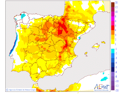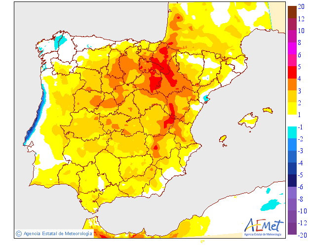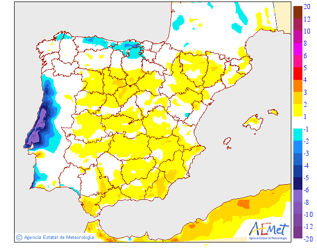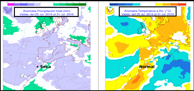 Según los modelos de Anomalías de AEMET (aquellos en los que se valora la situación actual respecto a unos valores promedios) se espera una Anomalía normal respecto a la temperatura y más seca, respecto a la precipitación.