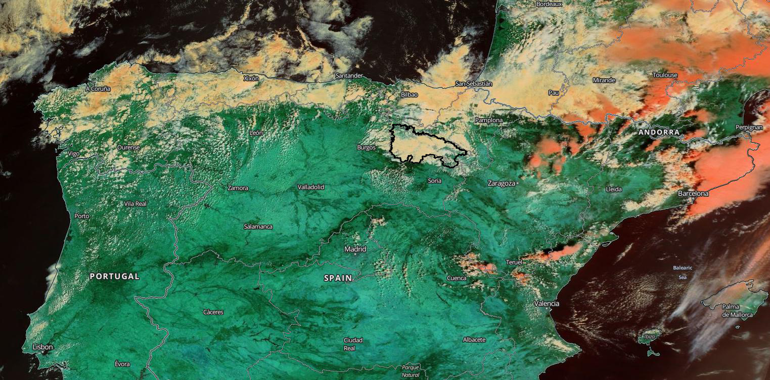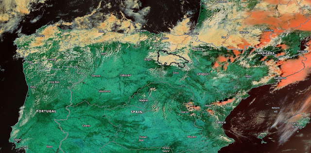 Esta nubosidad es consecuencia de la humedad que arrastran estos vientos en su recorrido por el Atlántico. Son nubes bajas-medias, denominadas Estratocúmulos y que así de bien se ven desde el satélite….