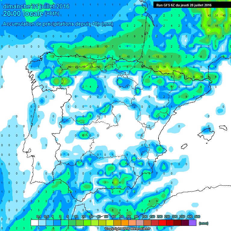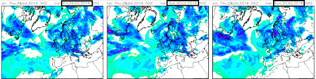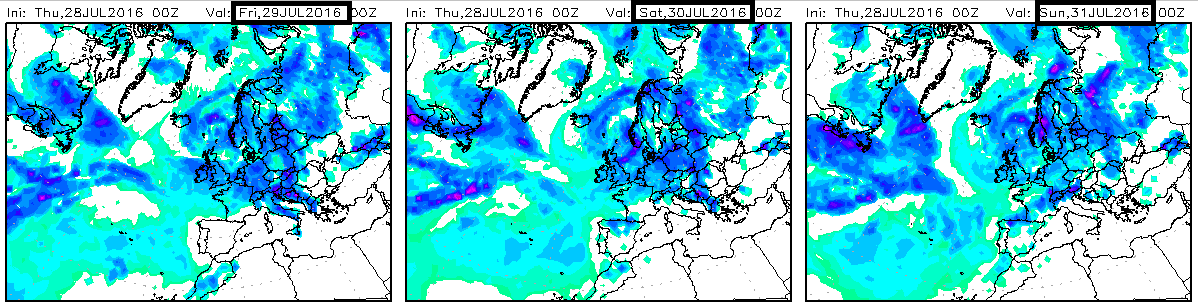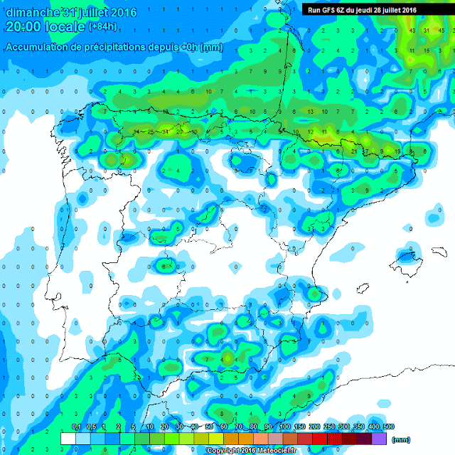 En los modelos globales de precipitación acumulada observamos que los acumulados esperados son poco importantes, y como ya os comento asociados a algunos amagos tormentosos.