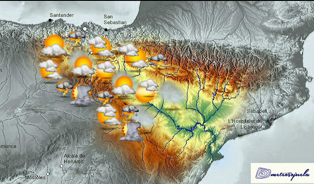 VIERNES 29 DE JULIO :TIEMPO VERANIEGO. CIELOS POCO NUBOSOS, CON ALGUNA NUBE DE EVOLUCION Y POSIBILIDAD DE TORMENTAS DE TARDE EN LA IBERICA. VIENTOS DEL S-SE Y TEMPERATURAS MAS ALTAS.