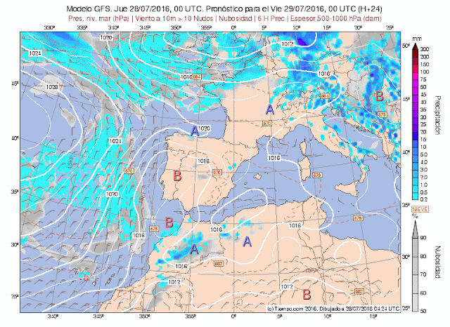 En los modelos isobáricos de superficie, se observa como los frentes que se acercan por el Atlántico quedan frenados por las altas presiones. También observamos una baja relativa, habitual por otra parte, y generada por el calentamiento diurno que favorece la llegada de vientos cálidos del S-Se y junto al aire frío en altura,hara que aumente la inestabilidad.
