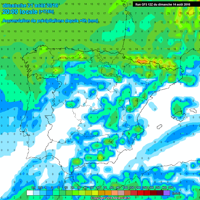 En cuanto a precipitación, podemos observar en los modelos de precipitación global  como prácticamente cualquier día de la semana puede llover algo. No parece que vaya a ser gran cosa y seguramente este asociado a la formación de chubascos tormentosos de tarde, los primeros días y a la llegada de un frente debilitado los últimos