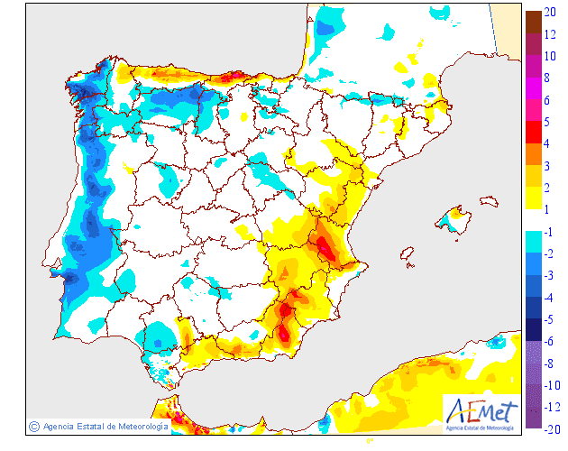 Según los modelos de Anomalías de AEMET (aquellos en los que se valora la situación actual respecto a unos valores promedios) se espera una  Anomalía más cálida respecto a la temperatura y  normal a la precipitación.