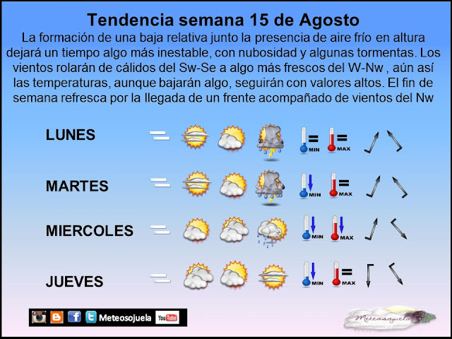 LUNES 15 DE AGOSTO : ALGO MAS INESTABLE. CIELOS POCO NUBOSOS ALPRINCIPIO, CON DESARROLLO DE NUBOSIDAD POR LA TARDE QUE PUEDEN DEJAR ALGUNAS TORMENTAS. VIENTOS DEL SW-SE Y TEMPERATURAS SIN CAMBIOS