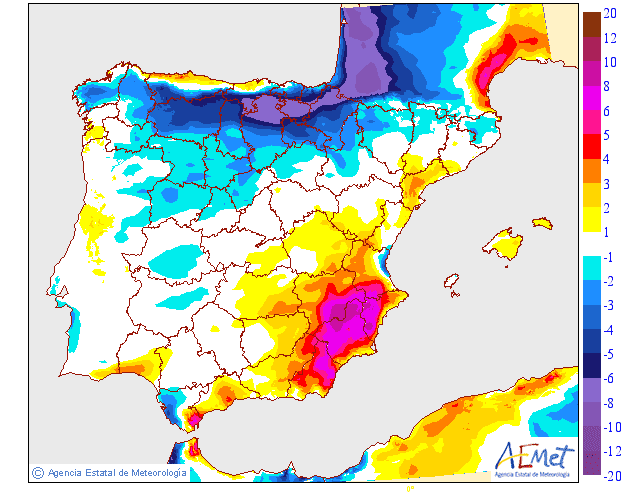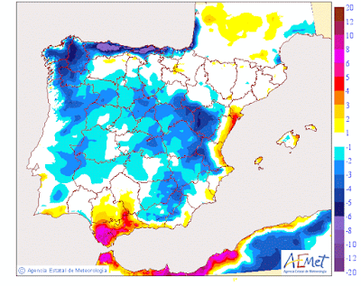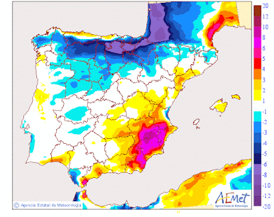 Según los modelos de Anomalías de AEMET (aquellos en los que se valora la situación actual respecto a unos valores promedios) se espera una Anomalía más cálida respecto a la temperatura y normal a la precipitación.