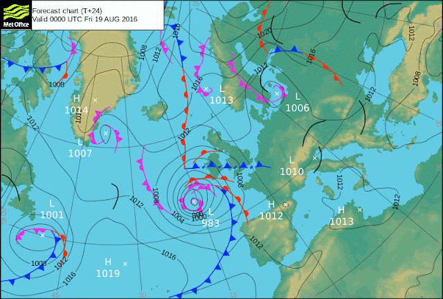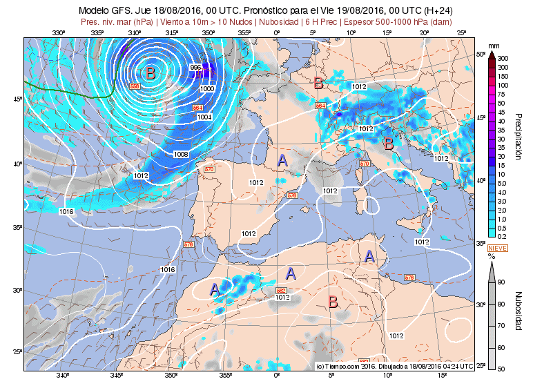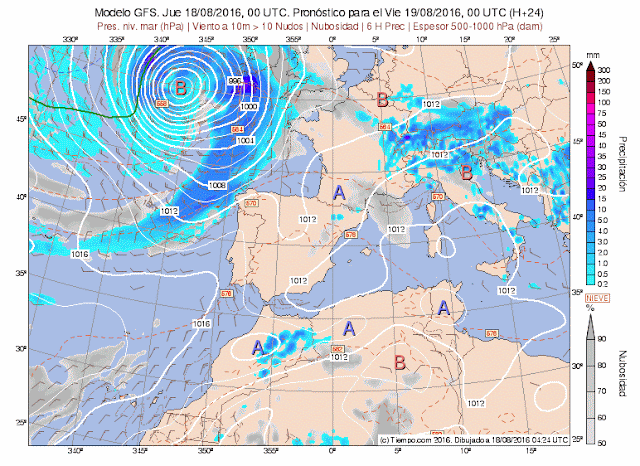 En los modelos isobáricos de superficie, se observa la profunda borrasca atlántica y sus frentes asociados dirigiéndose hacia las islas Británicas.