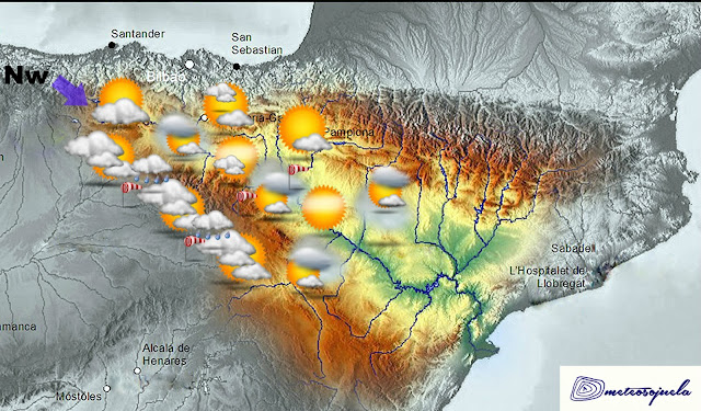 SABADO 20 DE AGOSTO : TIPICA SITUACION DEL NW, CON NUBES DE RETENCION EN EL OESTE Y CLAROS EN EL VALLE Y RIOJA BAJA. TENDENCIA A QUEDAR MENOS NUBOSO. TEMPERATURAS EN DESCENSO