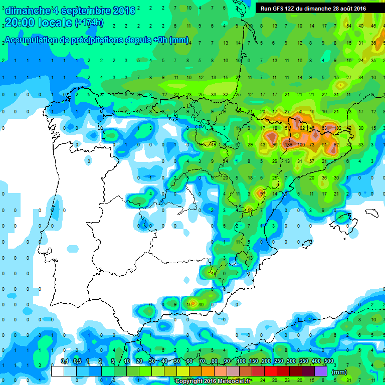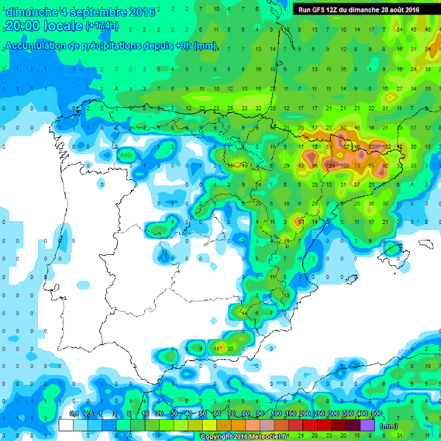 En los modelos globales de precipitación acumulada observamos que los acumulados pueden llegar a ser importantes en zonas de la Ibérica con acumulados de hasta 50 litros, todo ello asociado a la parición de nucleos tormentosos.