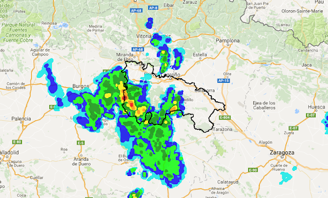 Así se podía ver desde el radar…..los nucleos más rojizos indican topes de nubes más fríos y suelen asociarse a mayor precipitación
