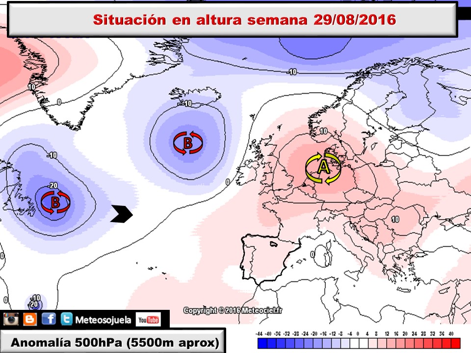 Uno de ellos, son estos mapas que se denominan Anomalías de Geopotencial a 500hPa y lo que valoran son las características de la atmósfera a 5500m en relación a un período de unos 30 años de referencia. Se toma 5500m como referencia por ser una zona sin influencia de factores terrestres.