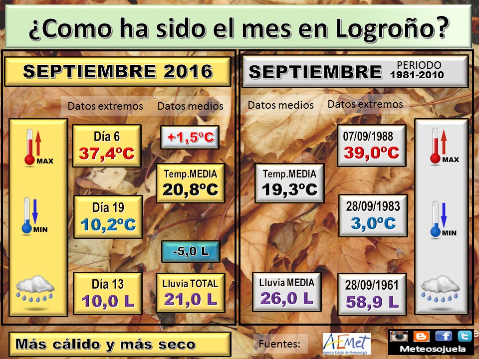 SEPTIEMBRE se ha comportado en LOGROÑO, como un mes MAS CALIDO, respecto a las temperaturas y MAS SECO, repsecto a la precipitación. Si observamos los datos de la Estación Meteorológica de Logroño podemos comprobar que los primeros 10 días del mes las temperaturas eran muy altas para la época superando en 7-8ºC la media de […]