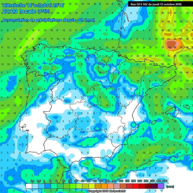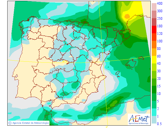En los modelos globales de precipitación acumulada observamos que las precipitaciones acumuladas disminuyen esperando recoger alrededor de 2-3 litros en el valle y delos 5-10 en montaña