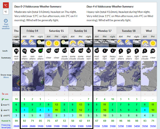 Aquí tenéis las previsiones en montaña teniendo como base la estación de Valdezcaray a 1500m. Este finde..varible con tendencia a mejorar!!. :))