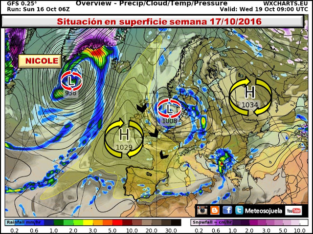 Observamos en superficie como la tendencia es a que las altas presiones bloqueen la llegada de borrascas y frentes atlánticos, de hecho, están evitando la llegada de los restos del huracán Nicole hacia Europa. Los vientos predominantes serán del N-Nw