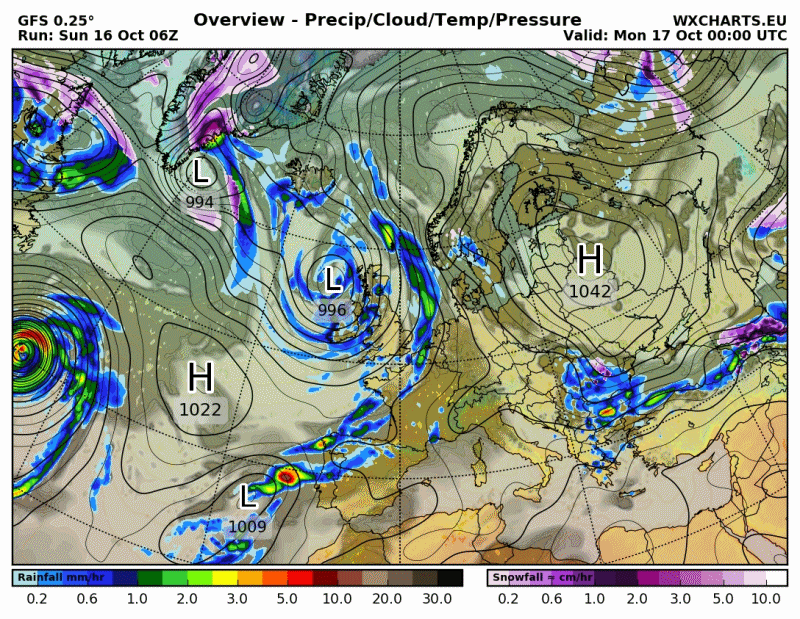 Fijaos en la animación de Wxcharts para esta semana. Animación cada 3 horas. Observamos el frente débil que nos afecta el lunes que dejará más nubosidad que precipitación. El martes algunos restos con tendencia a reforzarse las altas presiones disminuyendo la nubosidad , situación que cambiaría hacia el fin de semana con la llegada de esa profunda borrasca atlántica con sus frentes asociados que empezaríamos a notar, según los modelos a día de hoy, durante el domingo.