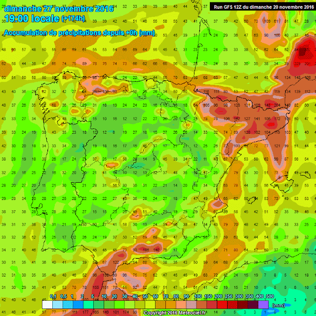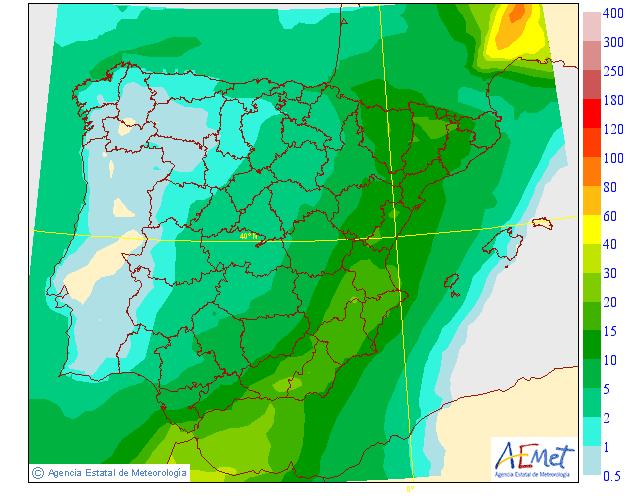 En los modelos globales de precipitación acumulada observamos, que los acumulados ondarán los 5-10 litros en el valle y los 25-30 litros en la Ibérica, poco en comparación con los 100 litros que se pueden alcanzar en el Pirineo