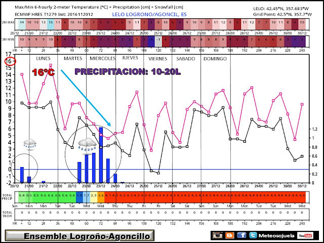 En el Ensemble del aeropuerto de Agoncillo que nos sirve para mirar la tendencia de la semana en nuestra región observamos, como las temperaturas van a sufrir un acusado descenso de hasta 8ºC, con precipitaciones que serán abundantes a mediados de semana