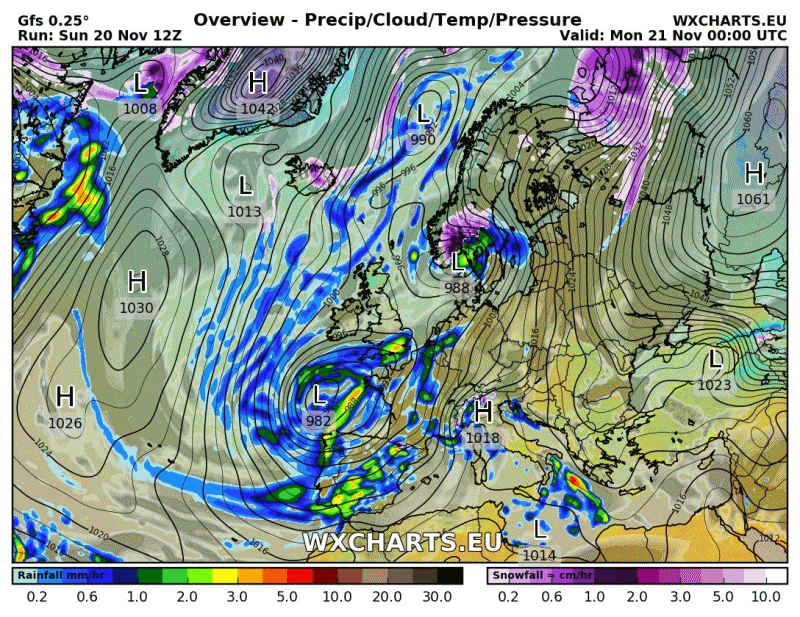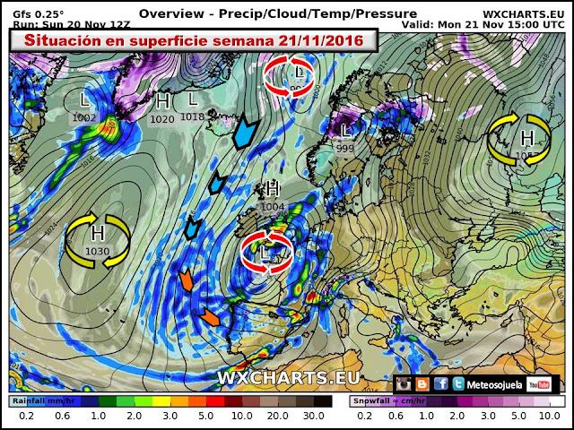 Fijaos en la animación de Wxcharts para esta semana. Animación cada 3 horas. Observamos lo que venimos contando, como evolucionan las borrascas a lo largo de la semana.