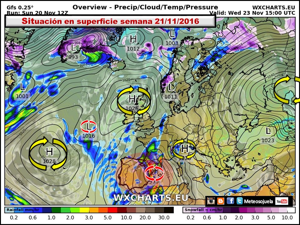Fijaos como la borrasca en la zona del Mediterráneo queda aislada por las altas presiones que la rodean, lo que le impide progresar y por eso se quedará entre nosotros hasta que se desgaste el aire frío en capas altas.