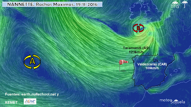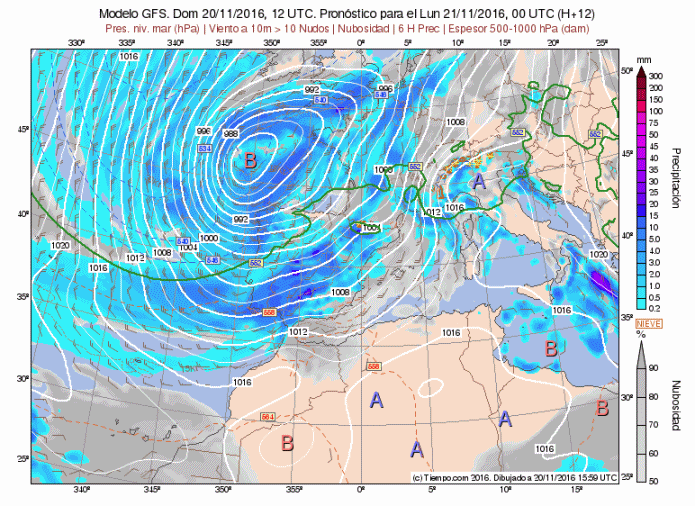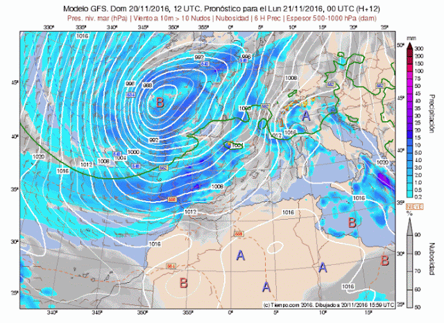 Y es que si observáis en la animación, la profunda borrasca que genera esos frentes se posiciona de manera que la parte más afectada es el oeste de la península, quedando nosotros al margen y siendo lo más destacable, los vientos que soplan fuertes en las cumbres..