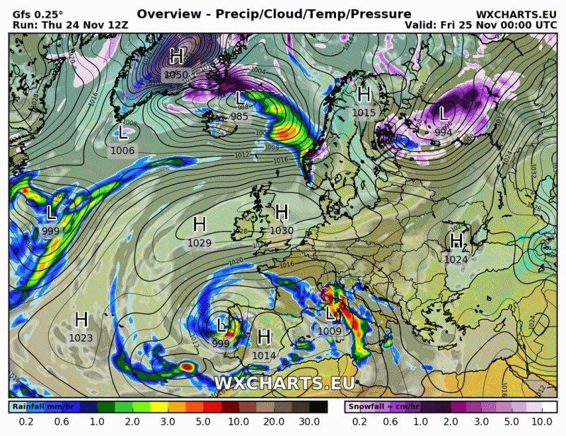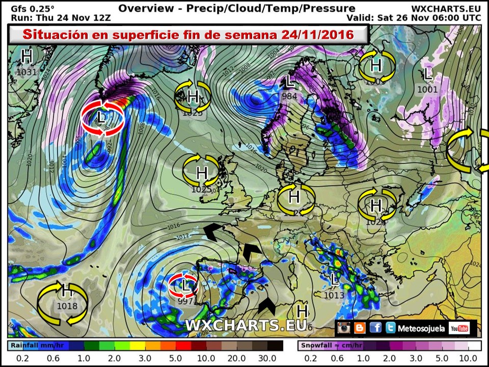 Observar también como se enrosca sobre la península generando en superficie una borrasca que gira alrededor de la península Ibérica.