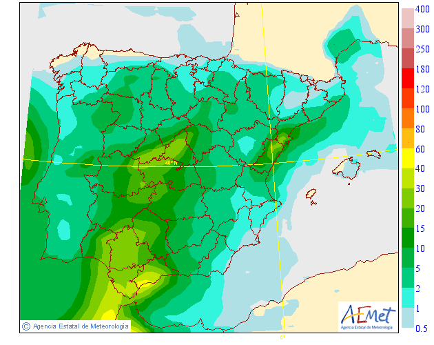 Se esperan precipitaciónes débiles en general asociadas al paso del frentes. Serán más intensas en las laderas de la Ibérica orientadas a los vientos dominantes del Se.