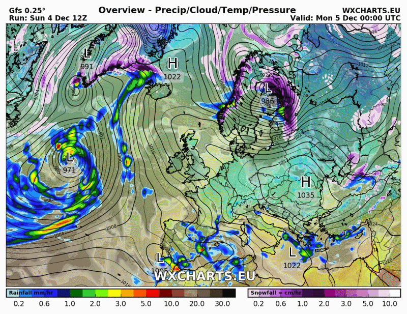 Fijaos en la animación de Wxcharts para esta semana. Animación cada 3 horas. Observamos lo que venimos contando, como la inestabilidad reinante hasta ahora desaparece poco a poco, con altas presiones que se situarán en Centroeuropa y una baja en el Atlántico que no puede progresar debido a la presencia del anticiclón.