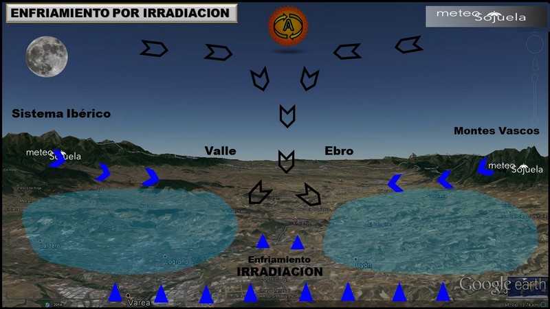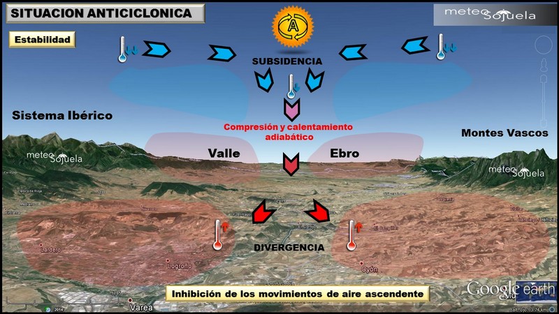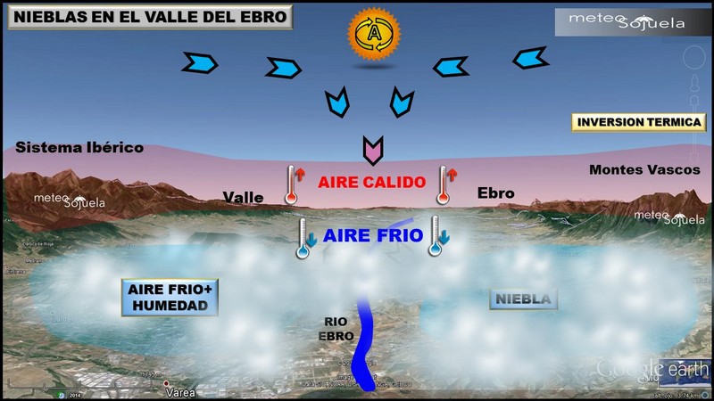 Debido a las características orográficas del valle del Ebro, en forma de hondonada, este aire frío y pesado queda estancado en el fondo y como decíamos antes, al estar inhibidos los movimientos ascendentes por las altas presiones queda inmóvil en zonas bajas.