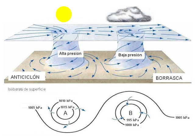 Las nieblas en el valle del Ebro se producen en situación anticiclónica. Si recordamos en los anticiclones la circulación del aire es de capas altas a capas bajas y girando los vientos en el sentido de las agujas del reloj.