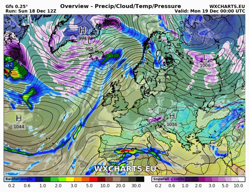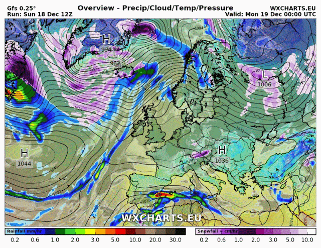 Fijaos en la animación de Wxcharts para esta semana. Animación cada 3 horas. Observamos lo que venimos contando, como comenzaríamos la semana con esa configuración de anticiclón en el Atlántico y bajas presiones en el Mediterráneo generando vientos del N-Nw que empujarán frentes que alcanzarán la región.