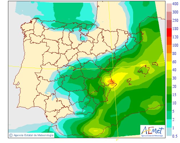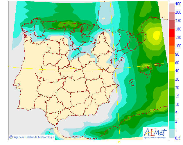 Precipitaciones débiles en general aunque en áreas de montaña y zona occidental pueden ser más intensas y persistentes.