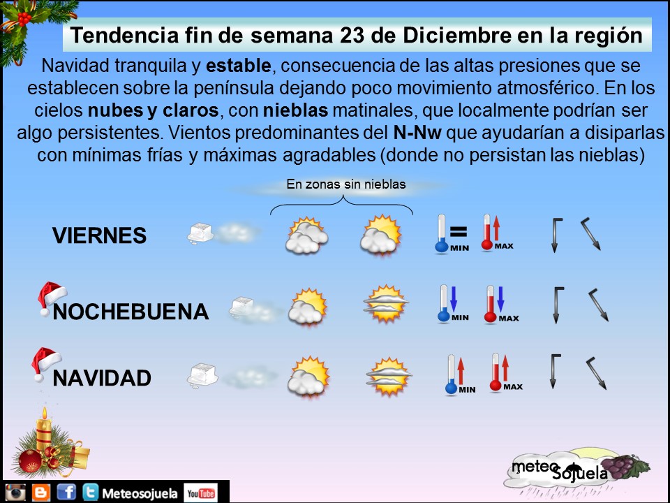 Navidades tranquilas y estables con riesgo de formación de nieblas.