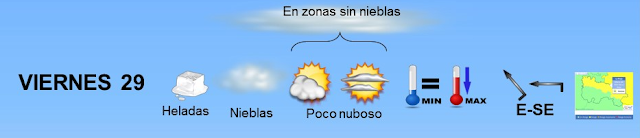 VIERNES 29 DE DICIEMBRE: TIEMPO ESTABLE Y FRIO. NIEBLAS PERSISTENTES EN EL VALLE CON CENCELLADA. CIELOS POCO NUBOSOS EN ZONAS ALTAS Y SIN NIEBLAS. VIENTOS DEL SE Y TEMPERATURAS MAS BAJAS. INVERSION TERMICA