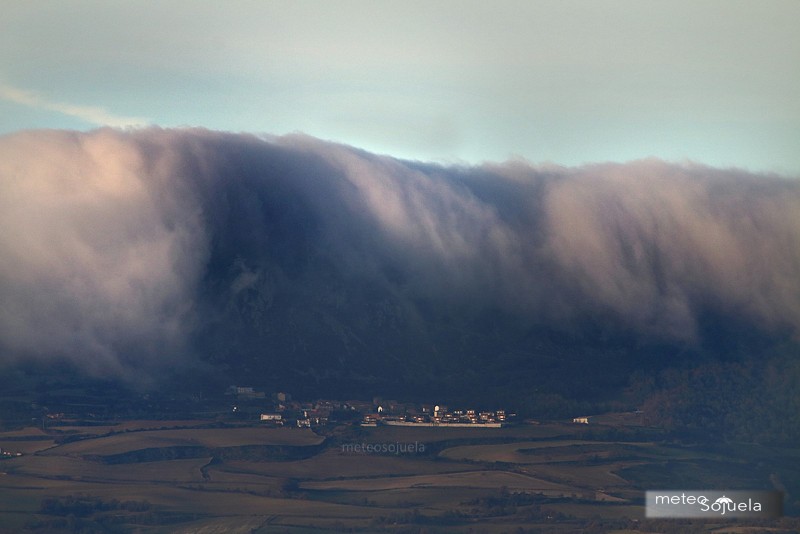 Muro típico de FOEHN. La masa de aire cargada de humedad empujada por vientos del Nw y procedente del Cantábrico, asciende obligada por la sierra de Cantabria, se enfría y condensa formando nubes y dejando lluvia en la cara norte. Superada la cima desciende, aumenta de presión se calienta y se seca. Clima típico del valle del Ebro. Son precisamente estos vientos del Nw los que, al secarase, nos libran de la humedad y ayudan a disipar las nieblas.