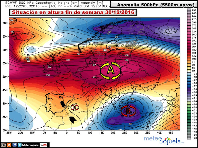 Observamos en altura , una anomalía positiva que nos augura un fin de semana estable y anticiclónico, aunque ya presenta signos de agotamiento.