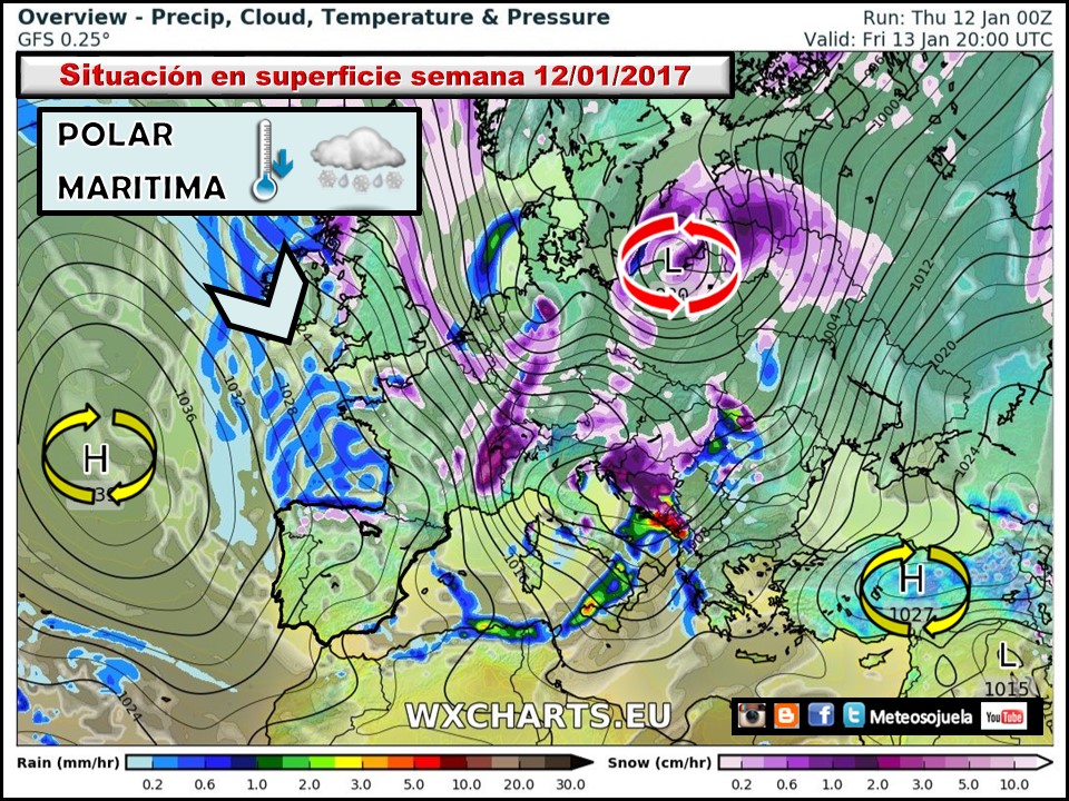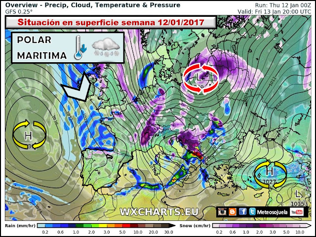 Pasillo perfecto para la llegada de frentes a la península, frentes que vendrán cargados de humedad por el gran recorrido marítimo que tienen. Masa POLAR-MARITIMA