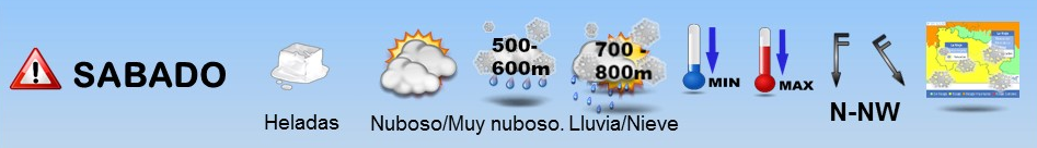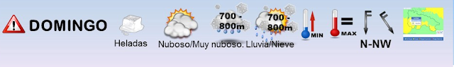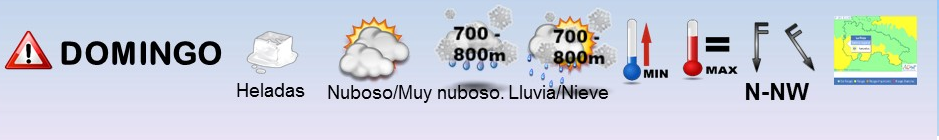 DOMINGO 15 DE ENERO : POCOS CAMBIOS. SEGUIRA EL PREDOMINIO DE LAS NUBES SOBRE LOS CLAROS CON PRECIPITACIONES. COTA DE NIEVE ENTORNO A 700-800M. VIENTOS MODERADOS DEL NNW. TEMPERATURAS FRIAS CON HELADAS