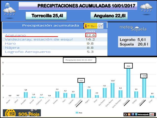recogiéndose cantidades que el martes rondaban los 25 litros pero que aumentaron el miércoles quedando al final entorno a los 30-40 litros, eso sí en la zona oeste de La Rioja porque en Rioja Baja apenas ha mojado los cielos