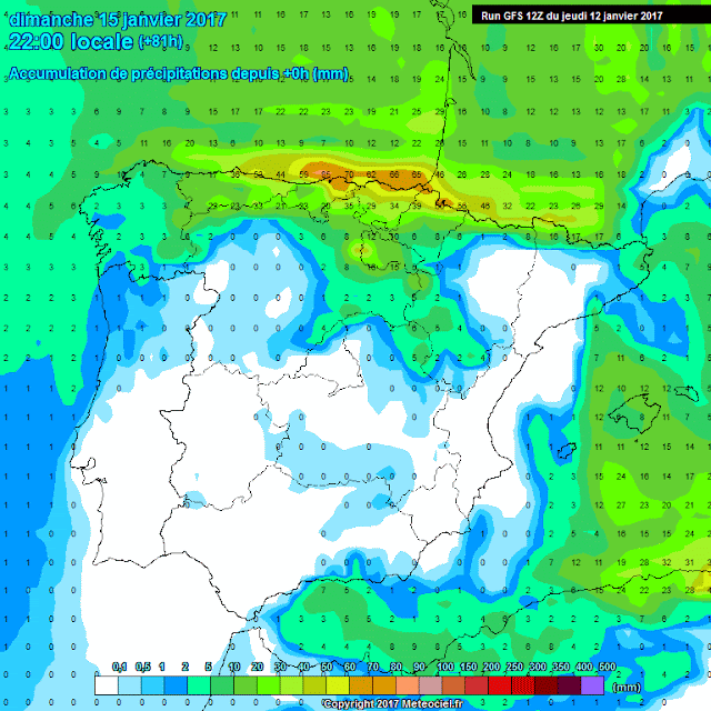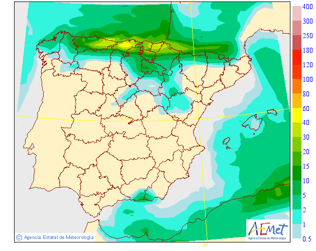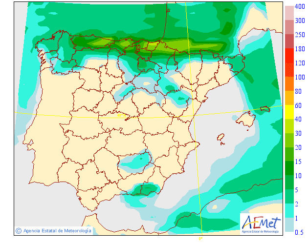 En los modelos globales de precipitación acumulada observamos que rondarán los 5-10 litros en el valle y unos 15-20 l en montaña, serán precipitaciones asociadas a la llegada de los frentes.