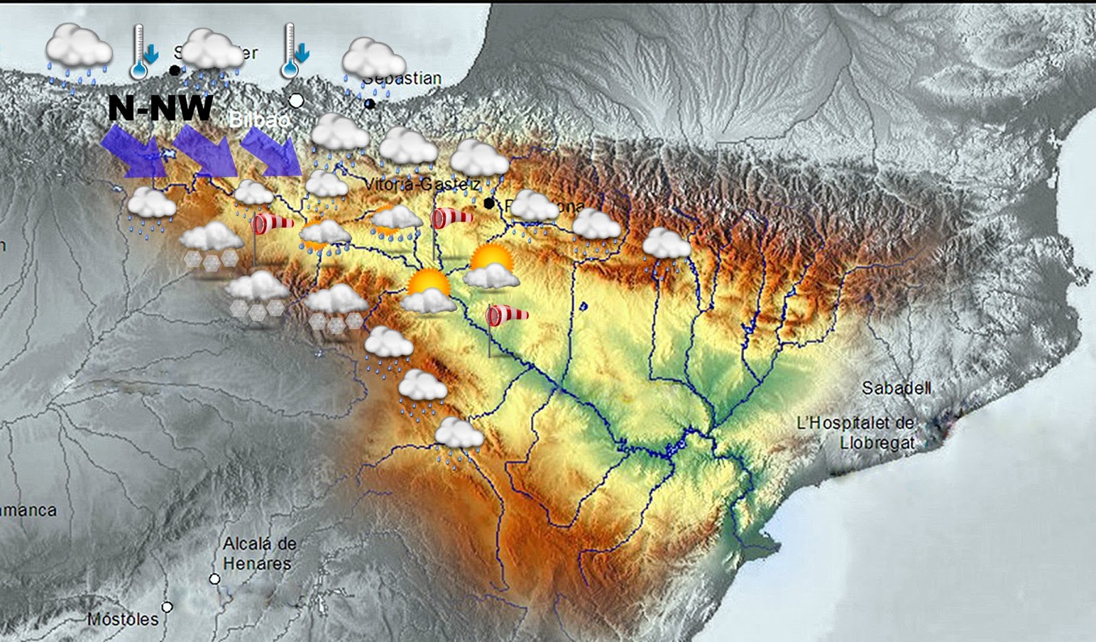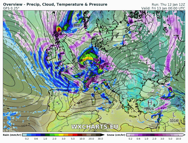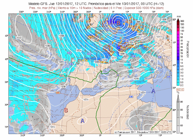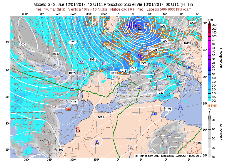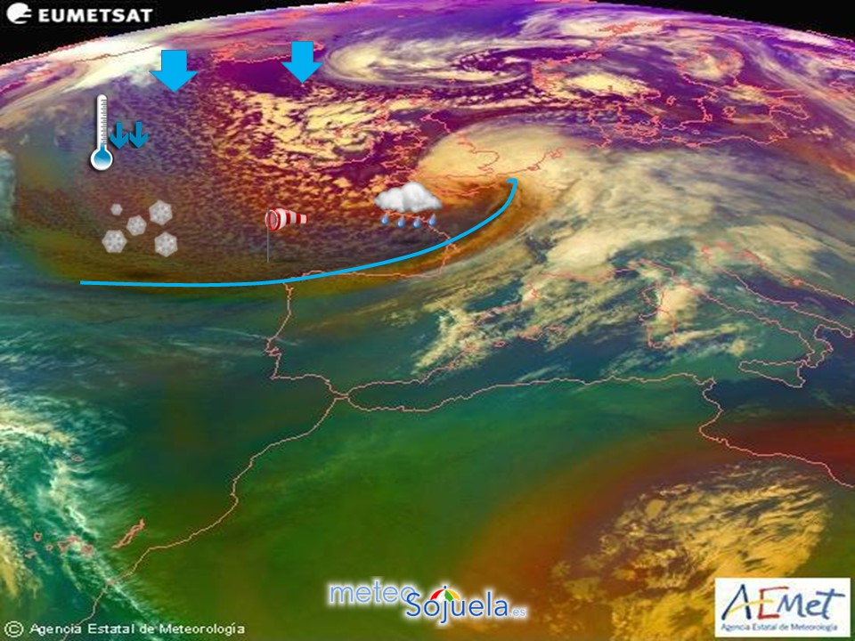 Así que ya véis, entrada típica de invierno. Temporal de frío viento, lluvia y nieve. Entre el anticiclón en el Atlántico y la borrasca del Mediterráneo se canalizan vientos del Nw que arrastran frente que dejarán cielos nubosos con precipitaciones de nieve en cotas bajas.