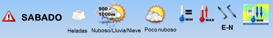 Intervalos de nubes y claros. Nubosidad de tipo medio-alto. Más nubosidad en zonas de montaña y más claros en el valle Precipitaciones débiles sobre todo en áreas de montañas, afectando puntualmente al valle. Mas probables cuanto más hacia el este. Cota de nieve al principio, en cualquier cota quedano luego entorno a 800-1000m