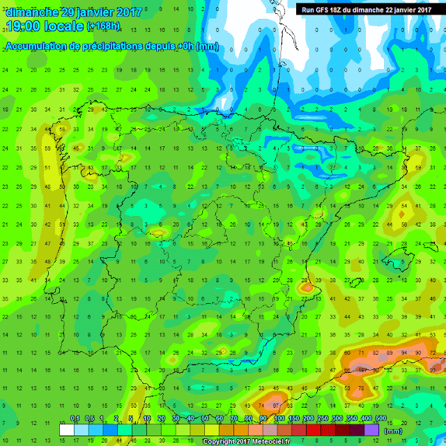 En los modelos globales de precipitación acumulada vemos que se pueden acumular cantidades de entre 2-5 litros en el valle y 15-20 en la