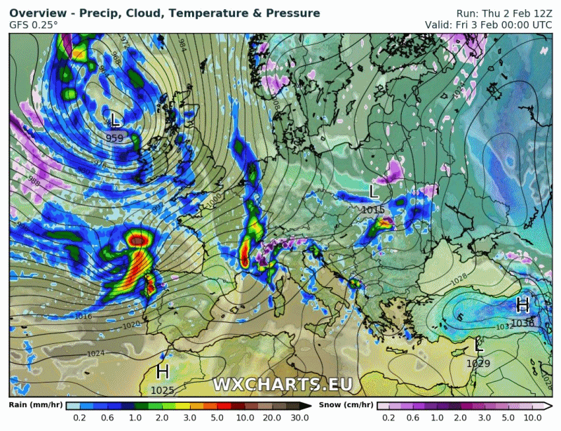 En la animación cada 6 horas de Wxcharts, vemos lo que vamos comentando. Carrusel de borrascas y frentes encadenados desde el Atlántico hacia la península.