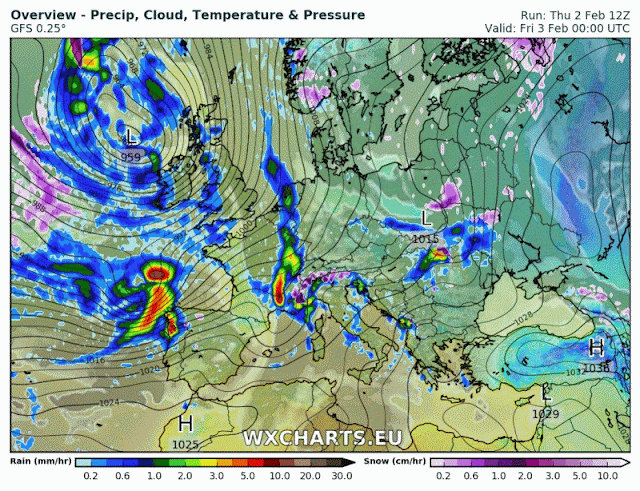 Os dejo aquí una animación con mapas diarios de Meteored. Secuencia cada 6 horas donde se observa, nubosidad, vientos, precipitación..etc
