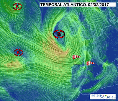 En supeficie origina las borrascas que normalmente discurren de oeste a este por latitudes altas pero ahora lo hacen directamente pasando por el Cantábrico y afectando de lleno a la península.