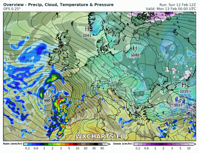 Fijaos en la animación de Wxcharts para esta semana. Animación cada 6 horas. Observamos como la profunda borrasca que nos ha afectado el fin de semana se desplaza hacia el NW, acompañada de vientos fuertes y precipitación. Después el anticiclón se extiende hacia la península dejando un tiempo más estable