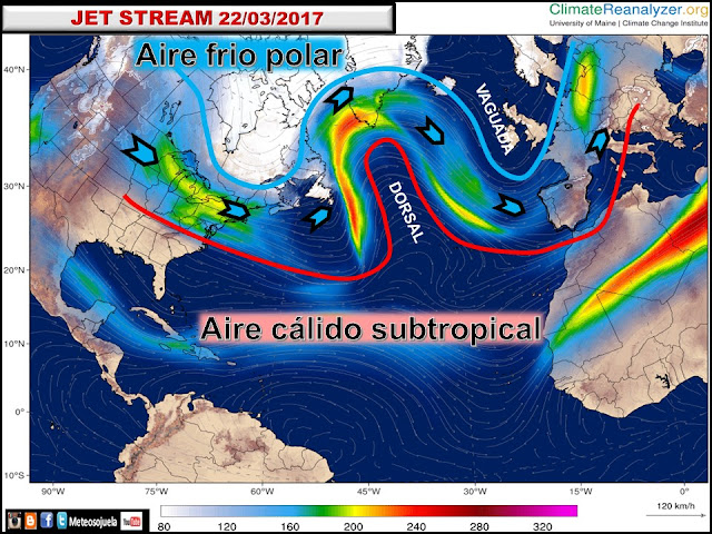 Cuando esto ocurre, el aire polar alcanza latitudes más bajas de lo habitual, dando lugar a las Vaguadas de Aire Frío en altura, y por otra parte también se produce un ascenso de aire cálido a latitudes más altas de lo habitual, dando lugar a las Dorsales.