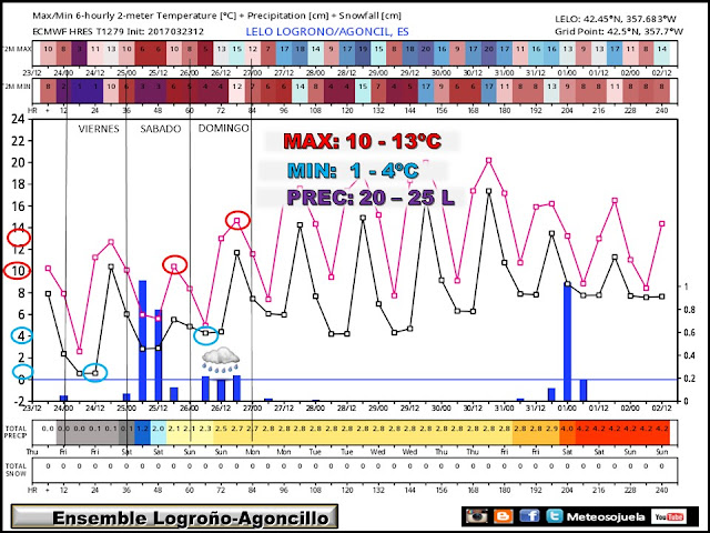 En los Ensembles del aeropuerto de Agoncillo donde se exponen la tendencia de temperaturas y precipitación, y que podemos hacer extensible a la zona de Logroño, observamos como las temperaturas se mantienen frías para esta época y se esperan precipitaciones que pueden ser abundantes durante el sábado